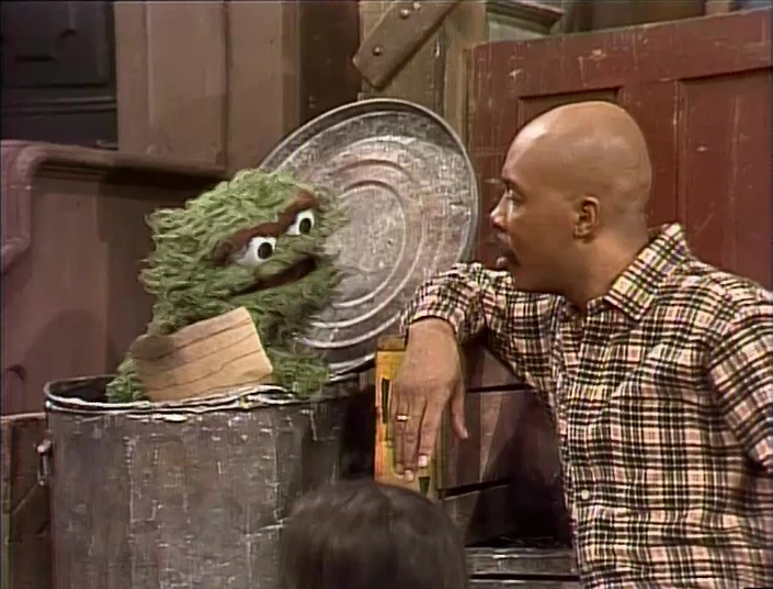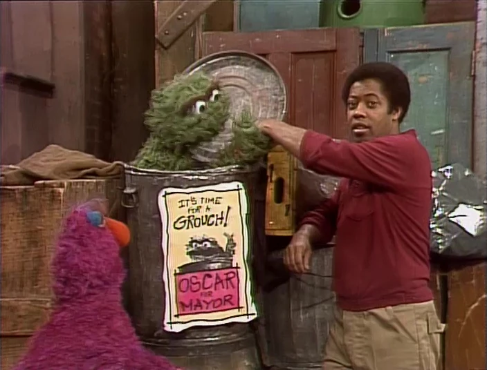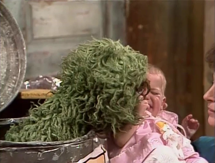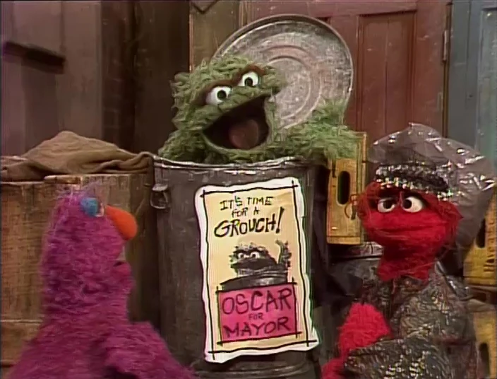 SCENE 2 | Telly Monster has been hired as Oscar's campaign manager. On his trash can is a sign reading "Oscar For Mayor. It's Time For A Grouch." Oscar yells at the people passing by to vote for him, but Telly informs him that the average citizen prefers a nice, friendly candidate. Oscar struggles at being pleasant as he practices on the grown-ups, even kissing Linda's baby niece. However, he gets too good at being nice, which turns off a potential Grouch voter (Kathryn Mullen). |