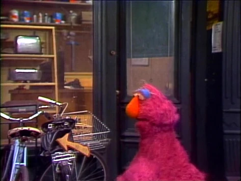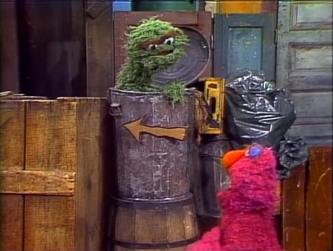 SCENE 1 | Oscar has an idea to ensure Telly leaves him alone for awhile. He introduces Telly to the "Near-Far-Follow the Arrows Game," in which Telly must follow a series of arrows until he is far from Oscar's trash can; the final arrow will lead to a sign marked with the word "FAR" to indicate he's gone as far as he can. Telly begins following the arrows down the block, past the Fix-It Shop. |