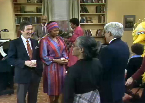 SCENE 5 | Everyone chats and has some post-show refreshments. Telly feeds Fluffy a snack, and Big Bird compliments Nico's performance. Bob also gives proper kudos to Gordon for his debut, and the two pose for a picture snapped by Olivia as Don Music announces the sponsors. |