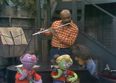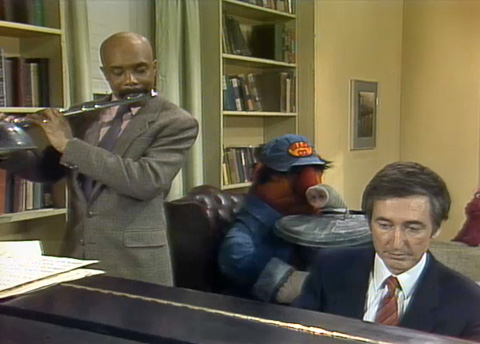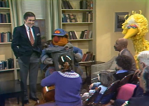 SCENE 3 | Bob's apartment is readied for the recital, of which Gordon is the only non-child participant. As Bob begins his introduction, Oscar the Grouch and Bruno the Trashman appear at the door. Oscar has brought Fluffy to perform trumpet, as she is one of Bob's previous students. Oscar assures Bob that Fluffy hasn't been practicing any Grouch tunes, which means he won't be sticking around to hear any of it. Fluffy astounds everyone with a perfect-sounding fanfare on trumpet, as Oscar sighs, "All that talent goin' to waste." |