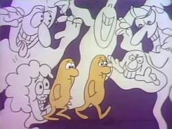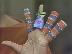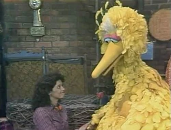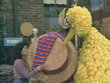 SCENE 5 | Snuffy returns to the nest wearing a hat and snuffle-warmer, so everyone will know he’s there in case he becomes invisible around them like Slimey. Meanwhile, the women are hanging around the stoop; Maria listens to her walkman while Olivia and Susan decide which movie to see. As Susan and Olivia go inside to fetch their money (settling on seeing The Invisible Man), Maria stays to enjoy her music, completely oblivious when Snuffy comes out and stands beside her trying to call her attention. Snuffy returns to Big Bird frustrated, so Big Bird exits to confirm with Olivia and Susan that they still haven't seen him (having been inside the whole time). Knowing this, Big Bird starts thinking Snuffy might really be imaginary after all, and marvels at his own imagination! |