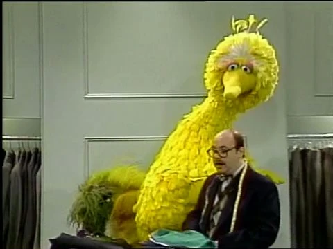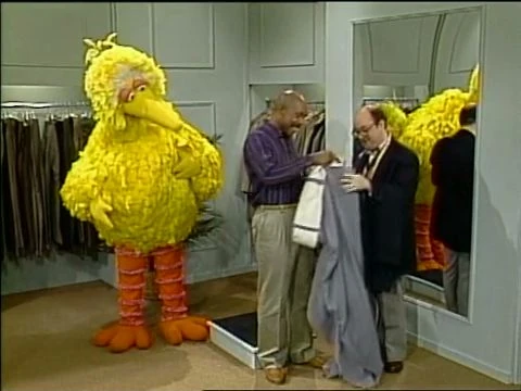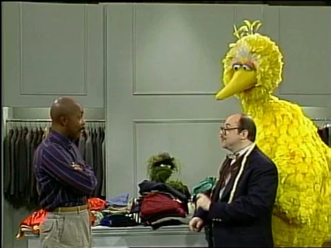SCENE 2 | At the department store, Big Bird and Grundgetta wait for Gordon to park the car. A salesman, FranΓ§ois, approaches them and thinks theyβre mother and son at first, but Big Bird corrects him. Big Bird selects a pair of jogging shorts, then imagines how Gordon would look if he were to wear them to his party. |
