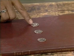 SCENE 2 | Big Bird has Gordon shuffle around three quarters to prove they always total three no matter how they're arranged. Big Bird claims it also proves adults can be forgetful, as Big Bird reminds Gordon of the quarter he loaned him yesterday. |