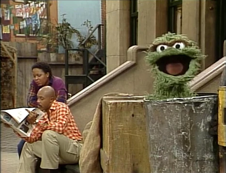 SCENE 2 | Oscar peeks out his can and sees Gordon and Olivia out on the stoop. The siblings confide in the viewer that even though they love each other, they each do certain things that drive the other crazy (such as Olivia reading over Gordon's shoulder, or Gordon picking the lint off Olivia's clothes). Oscar hopes some sort of argument will break out, but they instead just affirm how much they love each other (to Oscar's disgust). |