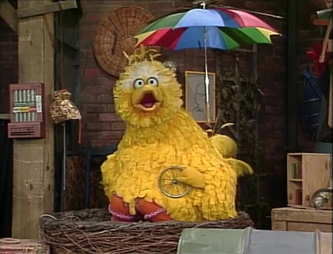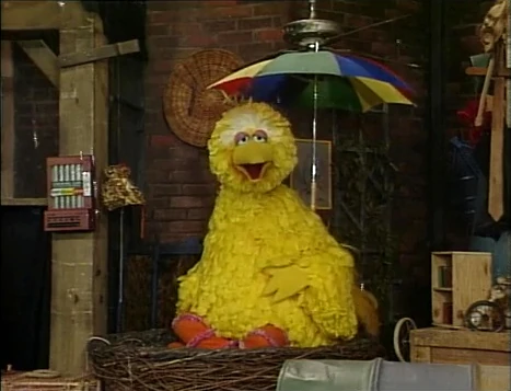 SCENE 5 | Now that the sun is out, Big Bird instead pretends his nest is a camel and he's delivering cookies across the desert to Cookie Monster at the oasis. However, another rainfall soon starts, ruining Big Bird's scenario once again. Gordon announces the sponsors. |