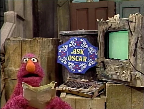 SCENE 4 | Telly introduces a computerized edition of Ask Oscar, where the computer will give programmed answers to today's questions. Telly is relieved at this change, believing the computer will be much more reliable than Oscar. Telly reads a question about games to play at Grouch birthday parties. He commands an answer on the keyboard and the screen gives Oscar's response - "NO Heh Heh Heh!!" |