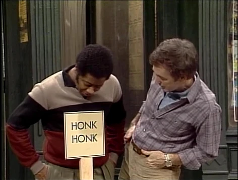 SCENE 3 | David and Bob come across a sign they've never seen on the block before, which merely reads "HONK HONK." They don't understand what it means, especially when a pair of waiting Honkers try to explain. A bus drives up and the Honkers pile on, indicating the sign is the Honker version of "BUS STOP." |
