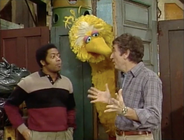 SCENE 1 | Bob and David are waiting for Big Bird to come out of his nest area before they go to see a movie downtown. David doesn't want to miss it, so Big Bird lets them go ahead of him so he can wait for Mr. Snuffleupagus. Snuffy shows up after they leave, and both he and Big Bird rush to the theater. |