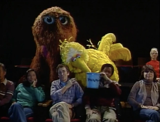 SCENE 1 cont'd | Big Bird and Snuffy arrive at the theater after the movie has started, and sit down behind Bob and David (who remain unaware of Snuffy's actual presence). Big Bird asks David for some popcorn, and Snuffy ends up devouring all of it. Snuffy is worried that the sad part of the movie (which he knows about) will make him cry, so Big Bird asks Bob to hand him a tissue. Snuffy asks Big Bird what time it is, and Big Bird says it's "early." Snuffy remembers that he told his mommy he'd be home early, and rushes back to his cave. Big Bird pleads for him to stay, and then gets into a noisy argument with Bob and David. |