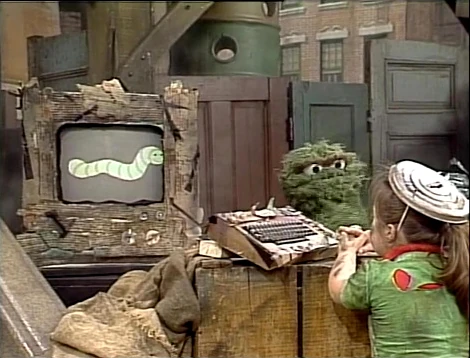 SCENE 2 | At today's Grouchketeer meeting, Oscar presents a lesson on the letter S. On his Grouch computer, he's loaded a program that shows grouchy images of S words when the S key is pressed. The kids each get a turn pressing the key, as the monitor whirls and smokes before revealing images of socks, sardines, and Slimey. Oscar himself takes a turn, as the computer screen shows the word "SCRAM," indicating the Grouchketeers should do just that. |