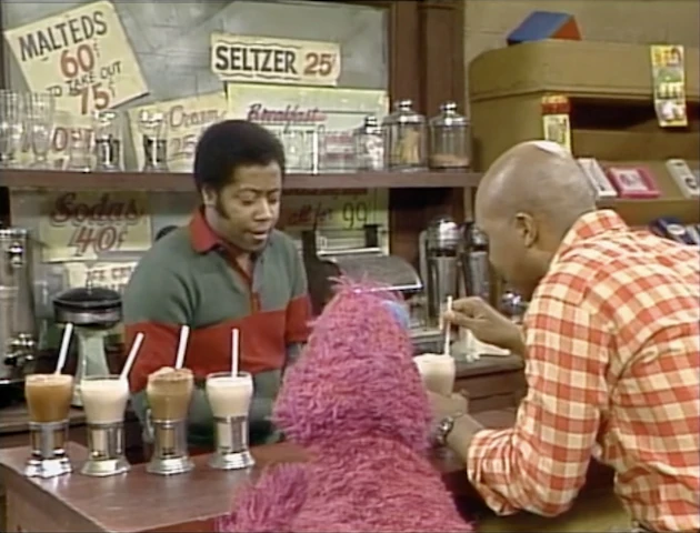 SCENE 5 | Gordon enters Hooper's Store where he greets Telly Monster and David. He would like an egg cream, but he wants it just the way Mr. Hooper used to make them. David says he thinks he could give it a shot by remembering, and proceeds to make the egg cream according to his memory of Mr. Hooper's method. Gordon tries it, and says it's good, but not as good as Mr. Hooper's. Telly is convinced that David has failed, but in David's defense, Mr. Hooper had years to perfect his technique; David is new at this, and just needs practice. He resolves to try again, and begins making another egg cream. (YouTube) |