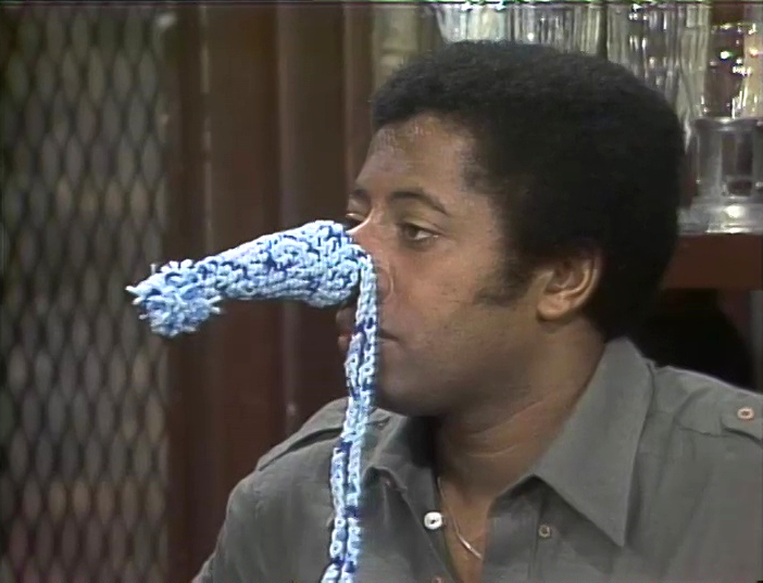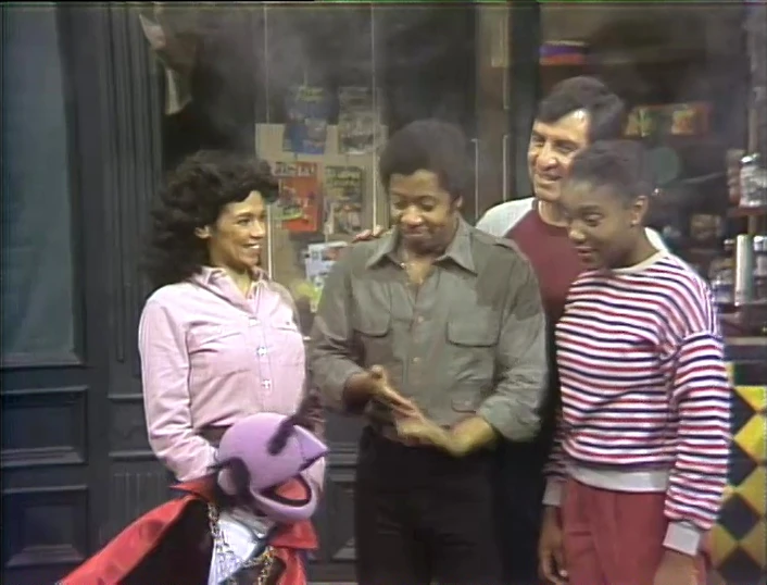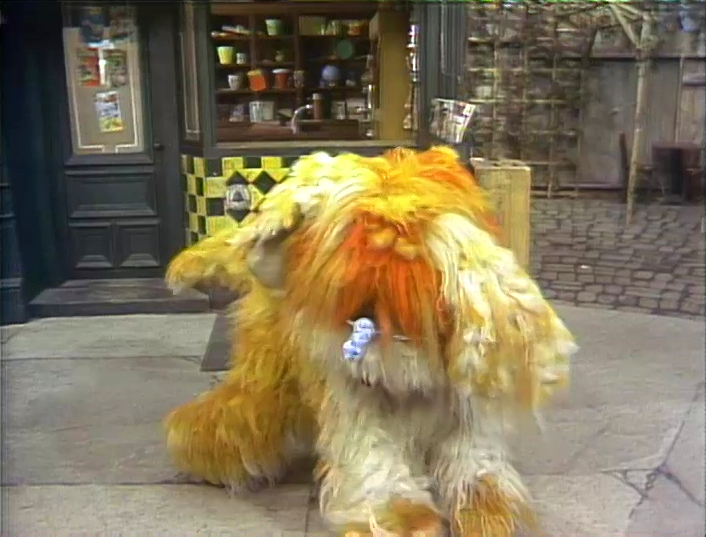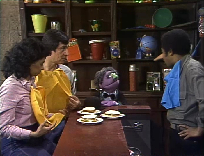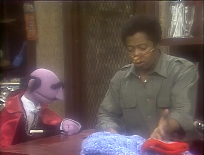 SCENE 1 cont'd | The Amazing Mumford stops by Hooper's Store, having gotten a second job with S.S.N.W.C. Inc. (Sesame Street Nose Warmer Company Incorporated). David recalls Grover also working for that company (referencing the previous sketch). Mumford has a different method of peddling his wares - magic, although David has no need for a nose warmer. He waves his wand and gives David an elephant-like warmer, then a tiny one. David complains neither of these fit, so Mumford gives it one more try. He waves his wand and the store fills with smoke; Mumford is gone, but... |