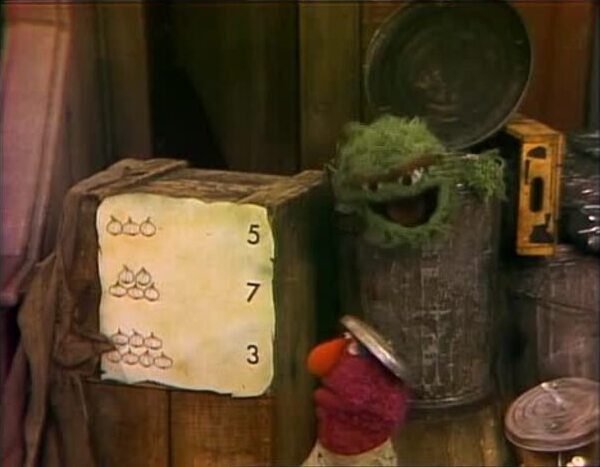 SCENE 3 | Next, Maria witnesses Oscar lead Telly and the Grouchketeers in another game, which has a poster with different amounts of onions and different numbers. The objective is to draw a line from one group of onions to the correct number in the group. Telly is nervous when Oscar calls on him, but he gets the answers right. Oscar tells the Grouchketeers to never give up as he closes the meeting, and Maria remarks to the viewer, "Even Oscar knows that sometimes Telly needs a little push." |