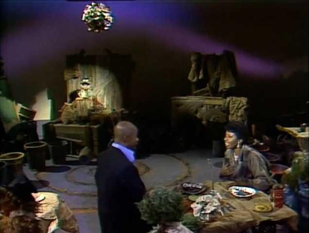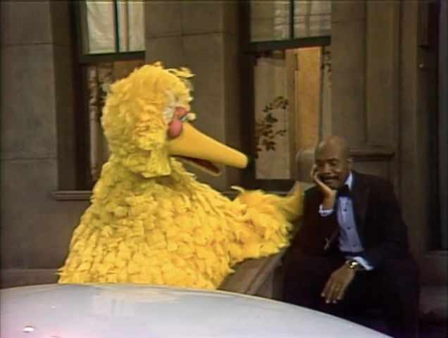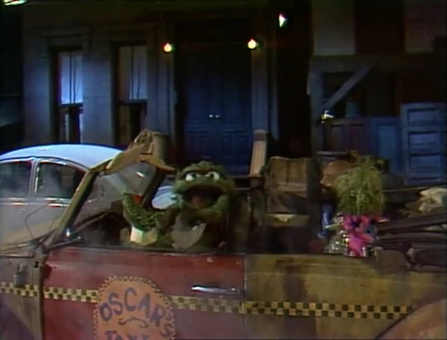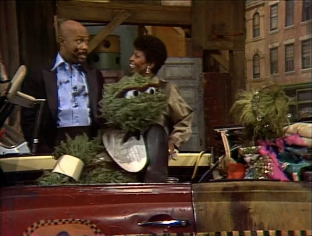 SCENE 4 | At night, Maria notices Gordon sitting on the steps, dressed up, looking sad. Big Bird comes by and correctly guesses what's going on: Gordon and Susan were going to go dancing tonight, but they're having car trouble. When Susan tries to fix the car, Gordon hands her a greasy wrench and accidentally wipes his shirt and his face with his dirty hand. Just then, Oscar and Grundgetta pass by in the Sloppy Jalopy, on their way to the Grouch Tarnished Silver Ball. Noticing Gordon and Susan's dirty appearance, the Grouches invite them to come along. |