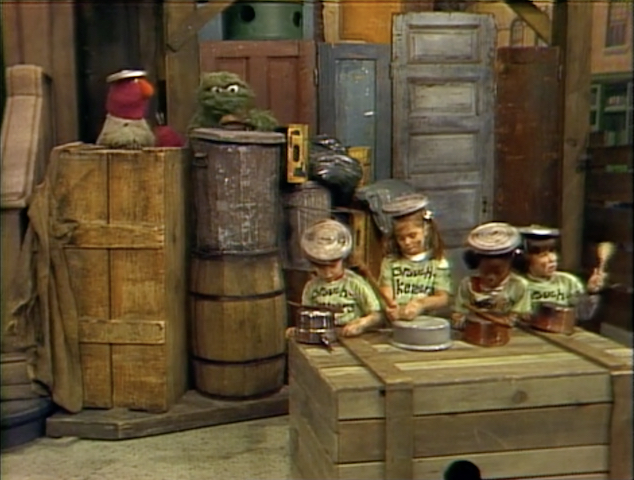 SCENE 2 | Maria witnesses Oscar leading the Grouchketeers (and the viewer) in practicing rhythms on their instruments. Oscar deliberately makes Telly play last, and gives him hard rhythms to repeat, but he eventually succeeds. |