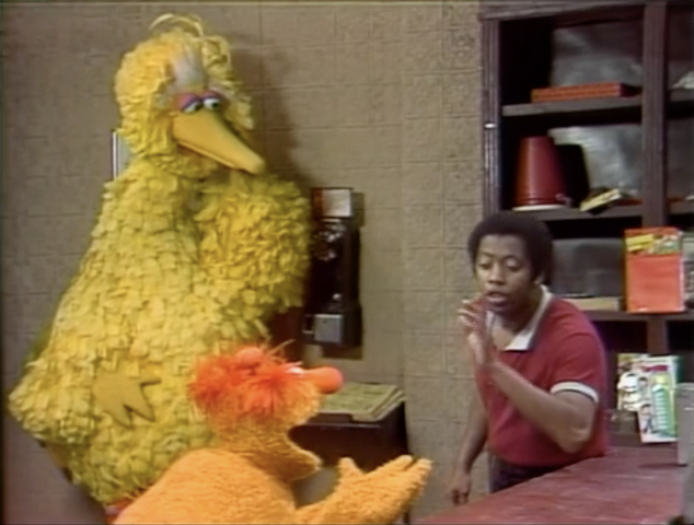 SCENE 5 | A Honker is trying to order something in Hooper's Store, but David can't understand him. He spots Big Bird standing in front of his construction doors and runs over to recruit his help; Big Bird can speak honk. Big Bird says he can't leave right now because he's waiting for Mr. Snuffleupagus, but he'll be happy to translate for him. David rushes back, memorizes the inflections in the Honker's query, and runs back to Big Bird who translates: ham and cheese on rye. David returns, makes the sandwich, but the Honker makes another request which David has to get Big Bird to translate: he wants it with tomato. The Honker satisfied, a Dinger arrives now with a request. David approaches Big Bird with a series of dings, but he has no idea what he's going on about. Big Bird speaks honk, not ding, but suggests David wait around for Snuffy since he's fluent in ding. |