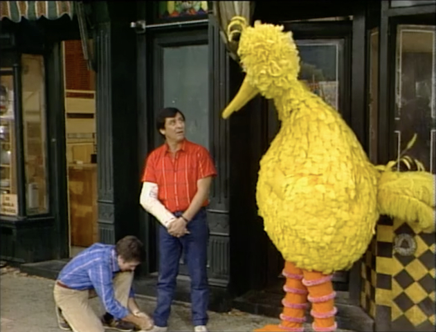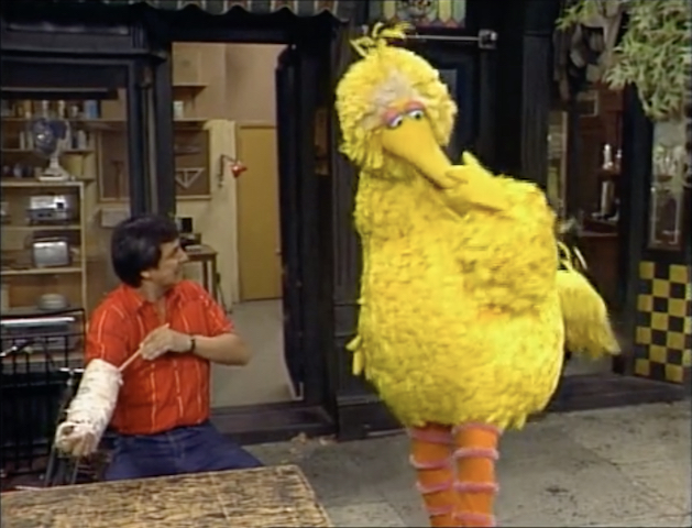 SCENE 4 | Luis now has an itch under his cast. After a few bad suggestions, Big Bird's solution is to stand on one leg, put your finger on your beak (or nose), then hop around. Although Luis feels he looks silly, he's surprised to find it actually works. Snuffy announces the sponsors. |