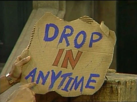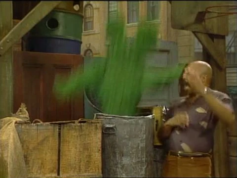 SCENE 2 | Gordon finds a sign lying next to Oscar's can reading, "Drop In Anytime." Oscar tells him that sign is for Grouches, who are always welcome to visit. Gordon doesn't think any of Oscar's friends will be able to read it given the average height of a Grouch, but Oscar assures him that they'll see the sign and tells Gordon to put it back. Sure enough, a plane flies overhead and many Grouches dive-bomb right into Oscar's can! |