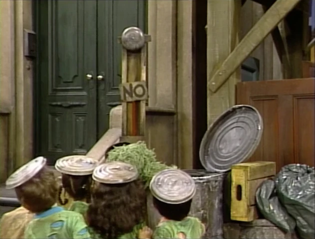 SCENE 2 | Oscar shows the Grouchketeers his Grouchometer, which will detect how loudly they can say the word "no." When nobody is able to do it, Oscar comes to the horrible conclusion that they'll have to cooperate. They do so and ring the machine's bell. |
