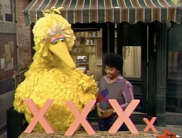 SCENE 5 | Big Bird plays "house" with a bunch of X figures. He introduces each of the "family members" to Susan, except for the baby, who she easily identifies. After being reminded that Susan is a nurse, Big Bird has her try to guess what's wrong with the baby X, which Susan finds impossible... until the baby X sneezes, much to her surprise. |