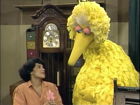 SCENE 2 | Big Bird swings by the Fix-It Shop and asks Maria how she's doing. She vents over all her body parts that are aching while spending all day trying to fix a grandfather clock. Big Bird brings her a handmade flower, which puts her in a much better mood. |