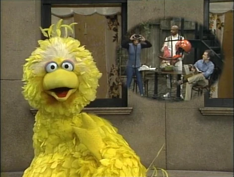 SCENE 1 | Big Bird observes Maria, Gordon, and Bob going about their business in the yard. He hopes that soon, one of them will leave so he can talk about subtraction, but none of them have any plans to move yet. Instead, Big Bird imagines them subtracting themselves in outlandish ways (Maria leaving to swim across the Atlantic Ocean and Gordon catching the 3 o'clock rocket to Mars; Bob remains put.). When Big Bird snaps back to reality, he notices Maria and Gordon have gone and assumes his fantasy is what really happened, much to the confusion of Bob. |