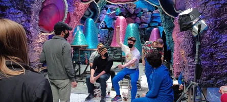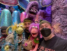 Puppeteers Jordan Lockhart, Ben Durocher, and Andrew G. Cooper prepare for a scene in the Glitter Globe