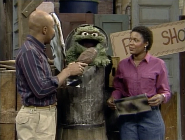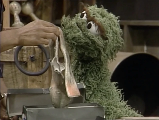 SCENE 2 | Oscar has a pet he wants to enter for the Pet Show that he keeps in a shoebox. Gordon and Olivia open the box to find that it's not an animal of any kind but a shoe that Oscar names "Lou." Gordon insists Lou can't be a pet because it's not alive, but Oscar pays him no mind. He shows them Lou's trick by throwing him through a hoop situated next to his trash can. Oscar's aware that Lou's not alive, but he doesn't mind; it means no work for him. |