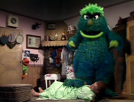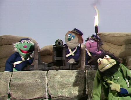 | Crazy Harry and a troop of Whatnot soldiers blow up houses, trees and airplanes to the tune of "Night Train." They blow a hole in the wall beside Statler and Waldorf's balcony. | |
