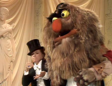 | Fozzie | Oh yeah, oh yeah. Uh... (clears throat) Tonight's wonderful guest star is the very talented lady of song and comedy, Miss Nancy Walker. (to the curtain) Now what? |