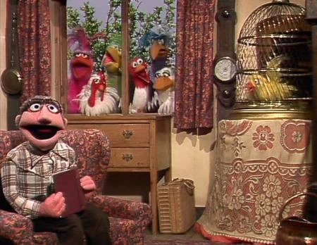 | A man listens to the singing of several birds, including his own pet bird that's in a cage, until a Giant Chicken crashes through his wall and puts him in the cage. |