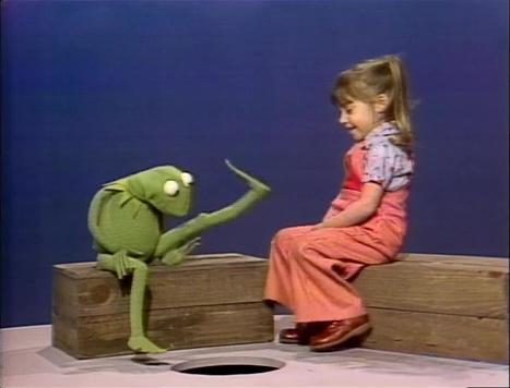 Muppets | Muppet & Kid Moment — Kermit and Jennifer bend their knees. Grover comes out of a hole in the ground, and Jennifer invites him to join them, but Grover remarks, "When you start talking about noses, give me a call." (First: Episode 1166) |
