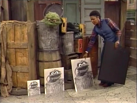 SCENE 2 | Olivia shows Oscar some prints of a photo she took of him. The picture comes in big, bigger, and biggest sizes. Olivia correctly guesses that Oscar wants the biggest copy, claiming he's the biggest Grouch she knows. |