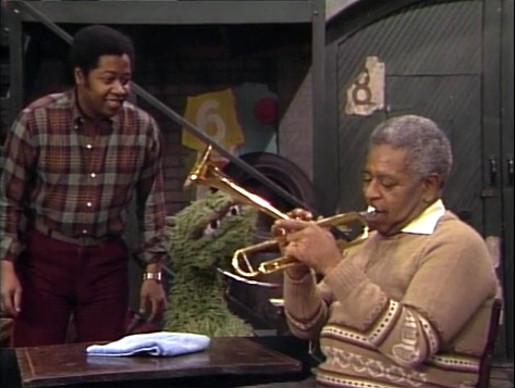 SCENE 5 | David and Oscar listen to the sounds of Bob's trumpet lesson. David comments at how well the student is getting, which Oscar thinks will ruin the joy of "Trumpet Afternoon." He's further annoyed when David compliments the young student after her lesson is over. Suddenly, Dizzy Gillespie takes the seat next to Oscar, who thinks his bent trumpet might make for some poor performance. A star-struck David asks him to play something and Dizzy blows out a jazzy tune on his horn. Oscar isn't as impressed as David. |