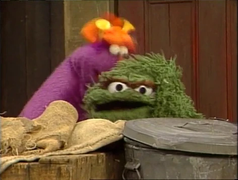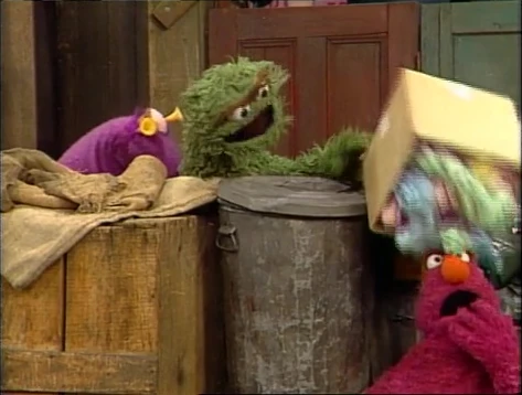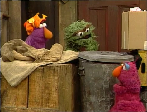 SCENE 1 | Oscar conspires with a Honker to play a trick on Telly in the guise of a game. Oscar points out the letter C on the Honker's hat and if Telly correctly guesses the C word they're thinking of, they'll buy him an ice cream cone; a wrong answer means he'll be pelted with old paper. Telly guesses the C word is "cap," but Oscar tells him he's wrong; they were instead thinking of the word "curls," referring to the mop of curly hair under the Honker's hat. Oscar pours a box of paper over Telly as promised. The Honker rates the trick a mere one honk, so Oscar schemes to improve it. |