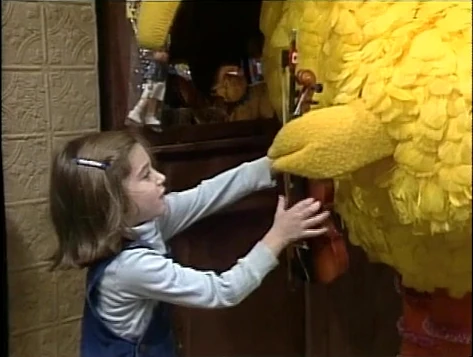 SCENE 2 | Sharon returns to Hooper's Store from the park. David placed her violin on one of the shelves to ensure it stays safe. She can't reach it, but Big Bird is tall enough to fetch it. She plays them all a piece on the violin and receives some applause. Big Bird makes sure he is applauded as well for getting the violin down in the first place. |