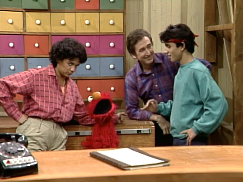 SCENE 4 | Elmo enters the Fix-it Shop to play a game. Maria tells him to make it a quiet game, so he proceeds to talk quiet. When Maria comments that he's not talking very loudly, Elmo starts to talk loud. He explains that he's playing the "quiet/loud game," where he switches from one to the other depending on what someone says. Maria has trouble getting her work done with all the noise, and it doesn't help when Bob and Piri interject and trigger Elmo by saying "quiet" and "loud." Maria tells him to play a game that doesn't involve any talking, so Elmo starts to stare silently at Maria - which still distracts her from working. |