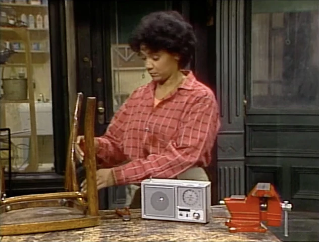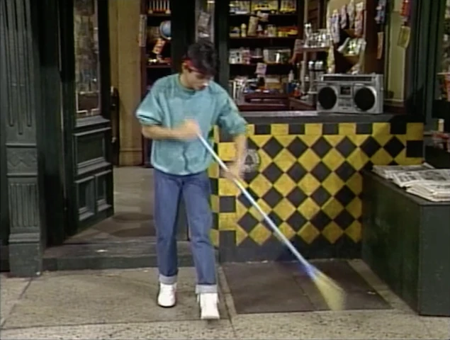 SCENE 3 | Maria plays some light music to work to at the Fix-It Shop. Her music suddenly gets drowned out by Piri's rock music at Hooper's Store. She turns up her music to cover Piri's, and he responds by doing the same. They realize this won't work for either of them and try to find a solution. They agree to listen to the same music and flip a coin to see whose music they'll listen to. Before they can see the result, Bob steps out from his apartment and asks that they turn their music off so he can play his piano in peace. |