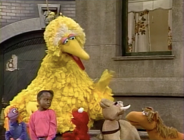 SCENE 1 | Big Bird, an Anything Muppet kid (Pam Arciero), Desiree, Elmo, and Gladys the Cow welcome the viewer one word at a time. However, Buster the Horse, who is supposed to say "Street," isn't present. They listen for his arrival, mistaking the sounds of Nicole on her roller skates, a motor scooter, and a bouncing ball for his galloping. Buster finally makes it, claiming he was caught in traffic. |