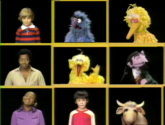Muppets / Cast | In a grid, Big Bird, Herry Monster, David, Olivia, Gladys the Cow, The Count and two kids rhyme the word "Hi." (First: Episode 1348) |