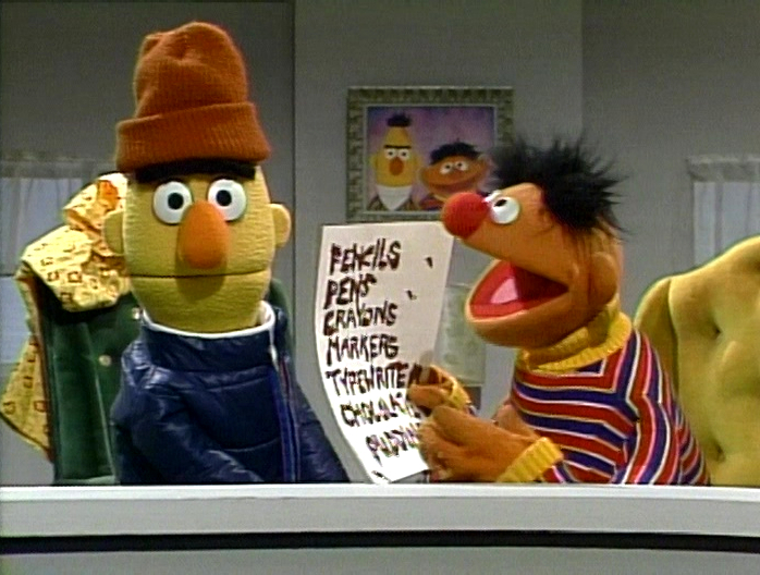 Muppets | Ernie and Bert: Ernie Makes a Grocery List β Bert observes Ernie write out a shopping list using chocolate pudding. (First: Episode 1967) |