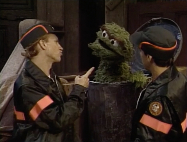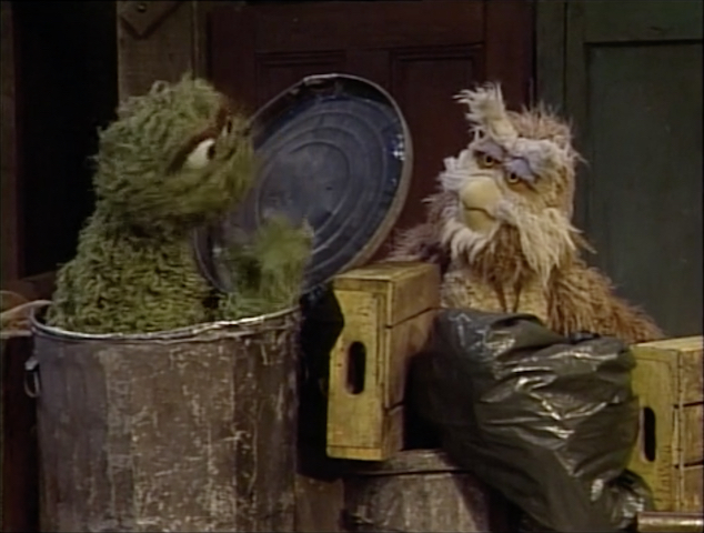 SCENE 4 | In the early morning, Hoots hangs out beside Oscar's trash can and realizes it's time for him to sleep. Oscar wonders why Hoots goes to sleep in the morning; Hoots remarks, "Doesn't everybody?" Just then, the garbage men come and pick up Oscar's trash can so they can empty it. They hear Oscar's voice from inside, put his trash can back, and let him off with a warning. Hoots is astonished that Oscar does this every morning; Oscar answers, "Doesn't everybody?" |