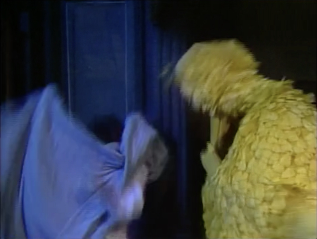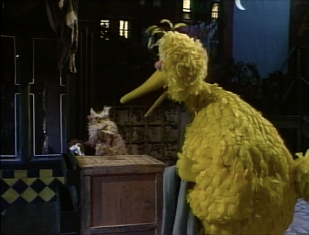 SCENE 2 | While Hoots continues playing his lullaby, Maria emerges in her nightgown to see if she locked the door to the Fix-It Shop. She didn't lock it, so she goes inside to make sure they haven't been robbed. Just then a fire truck passes by, which wakes up Big Bird. He gets up and notices that the Fix-it Shop is open and the light is on - he knows it's supposed to be closed. He goes over to investigate, and before Hoots can tell him what's going on Big Bird tries to guess what happened. Maybe a big gust of wind opened the door, or maybe some Martians are looking for Maria? He throws his blanket over what he assumes to be a Martian when they exit the shop, but is actually Maria. She gives him his blanket back, and assures him there were no Martians. Once Big Bird gets back to his nest, she wonders again if she locked the Fix-it Shop door... |