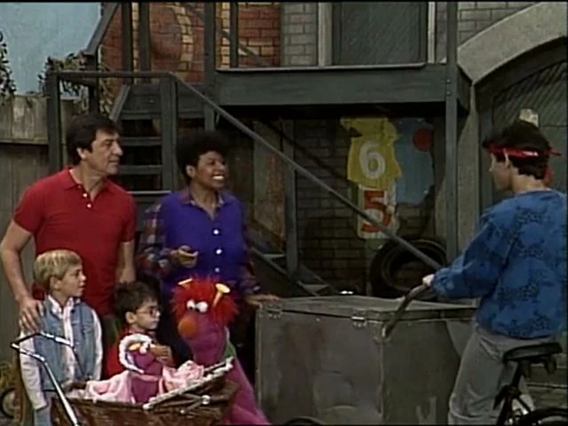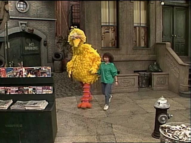 SCENE 2 | Big Bird asks Micki to hold his hand while he practices crossing the street (actually going from the stoop of 123 Sesame Street to Hooper's Store). They cross a couple of times before agreeing to go back to Hooper's for lunch. Big Bird asks to hold her hand even though they're through pretending; he just likes holding her hand. |