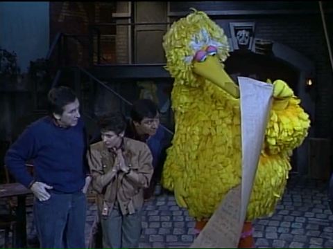 SCENE 5 | Big Bird catches Bob, Linda, and Luis as they are about to head home and asks them to watch while he wishes on a star, hoping that some extra ears and eyes will help make them come true. He picks out a star, then starts reading from a long list of wishes. |