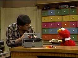 SCENE 3 | Luis works on fixing Bob's typewriter at the Fix-It Shop, which inspires Elmo to find a job too. He returns posing as a train conductor (offering Luis a ride to Chicago), then a policeman (wanting to arrest the broken typewriter), then a waiter. The latter proves to be the most useful job, as he provides Luis with some much needed lunch. |