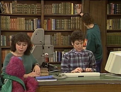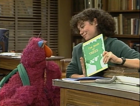 SCENE 1 | At the library, Telly Monster looks for a book called The Book of Trees. Micki helps him look in the section it should be in, but it's not there. They consult with Linda, who searches for the book in the computer database. She finds the book is already checked out... to Telly, and it's due today. Telly knows all that already; he just doesn't remember where the book is. They discover it was in his backpack the entire time. |