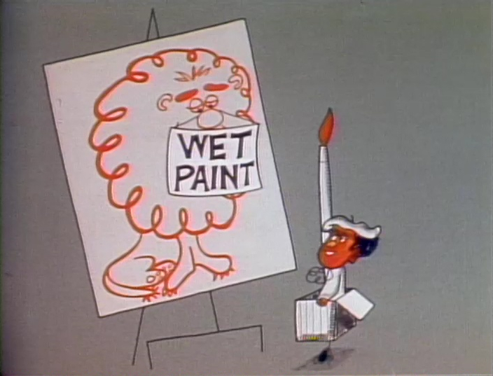 Cartoon | A painter pops out of a box and paints a lion, then hangs a "wet paint" sign on it. (First: Episode 1397) |