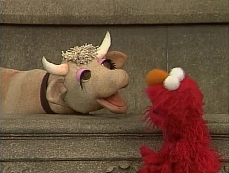 SCENE 4 | Elmo now plays a game with Gladys the Cow where he guesses what kind of animal she is. Gladys enjoys the game because it describes her best attributes, but is upset that Elmo ends it so soon. She attempts to play it now with Barkley, but sees communication isn't his strong suit. |