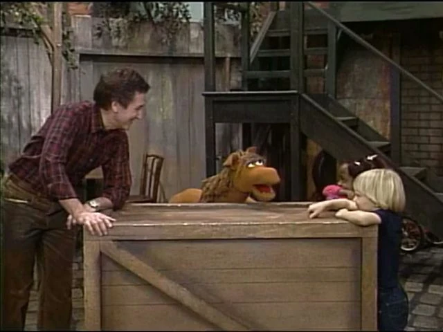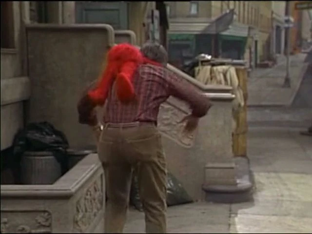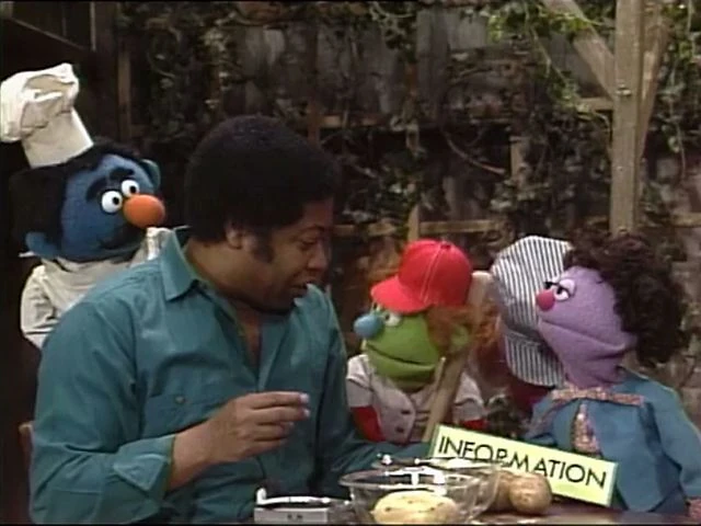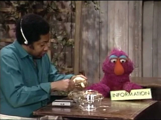 SCENE 1 | Telly displays a sign that reads "INFORMATION" so he can give an explanation of what the word means. He comes to believe that by having the sign, people might turn to him for information he doesn't know ("I'm no Mr. Wizard," he comments). He looks to a grownup for help, specifically David who's busy peeling potatoes. David accepts the sign, but doesn't think what Telly suggests will come true. Right after Telly leaves, a series of Anything Muppets appear and bombard David with inquiries about information he doesn't know (such as where to find a conductor's lost train and which airplane gate is to London). |